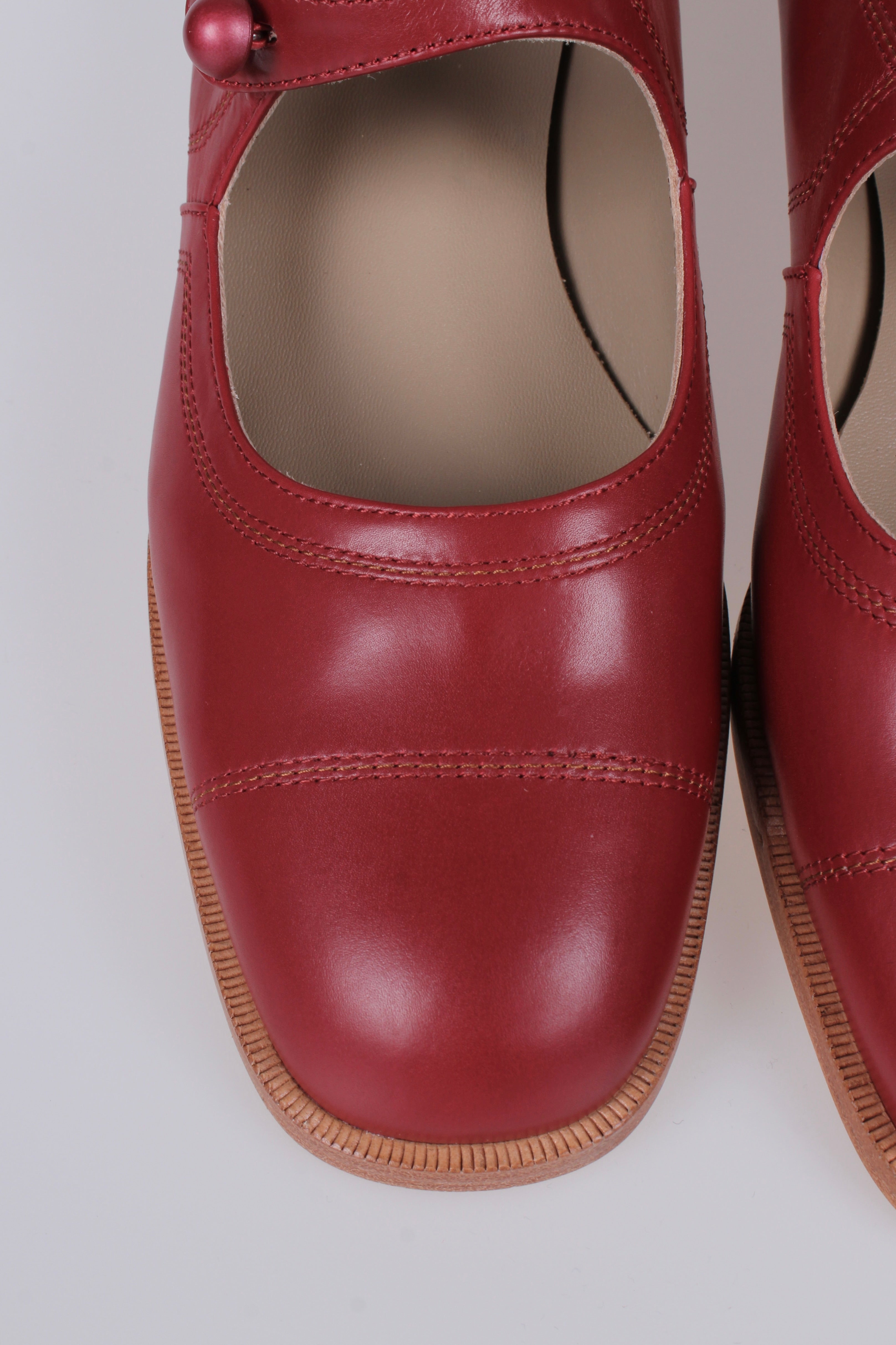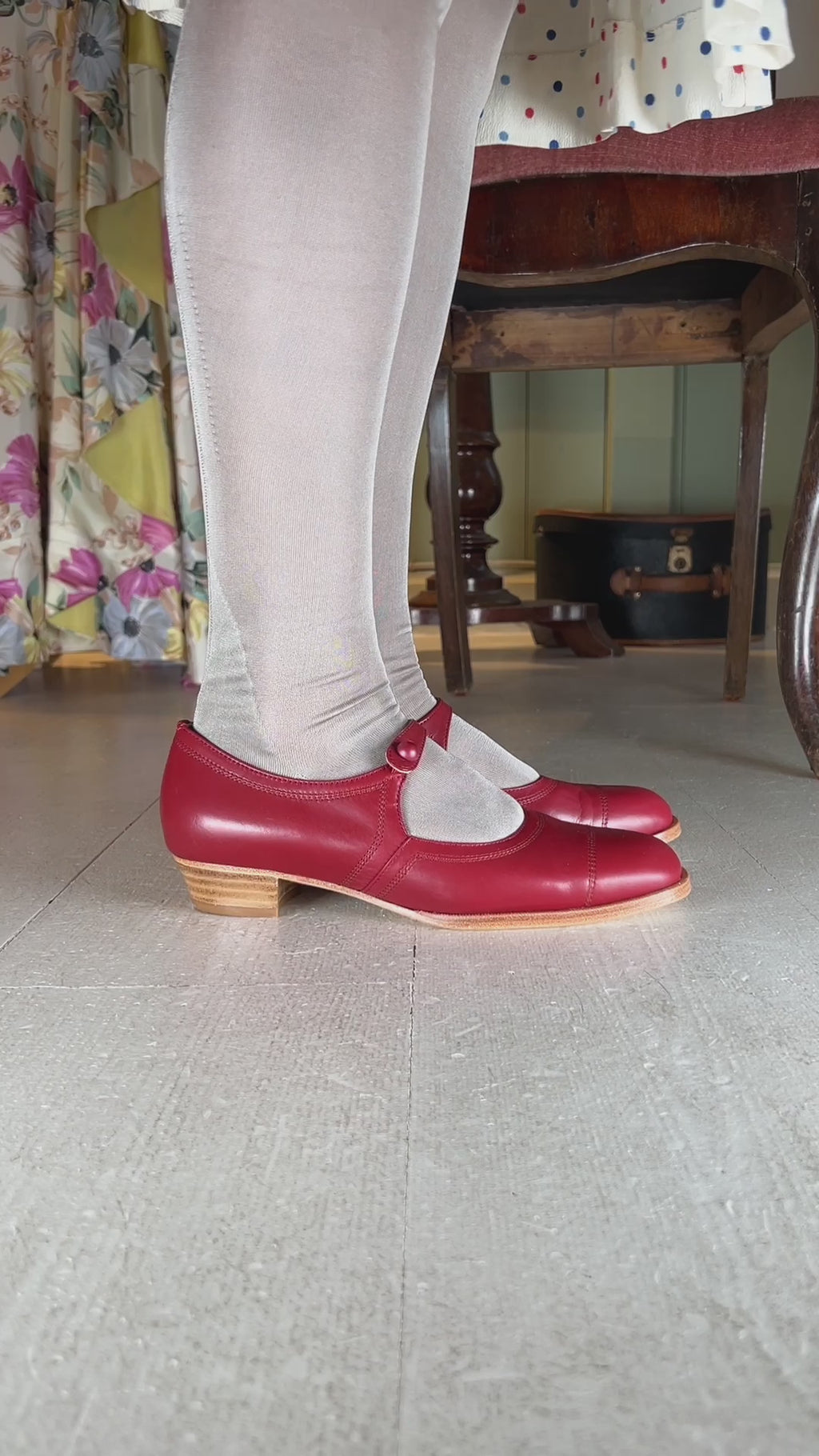 Disse charmerende hverdagssko med lav hæl er inspireret af 1920’ernes tidløse stil. Skoene har en bred, behagelig snude og en klassisk ankelrem, som lukkes med en enkelt knap syet fast på elastik – en elegant detalje, der samtidig giver fleksibilitet og god pasform.