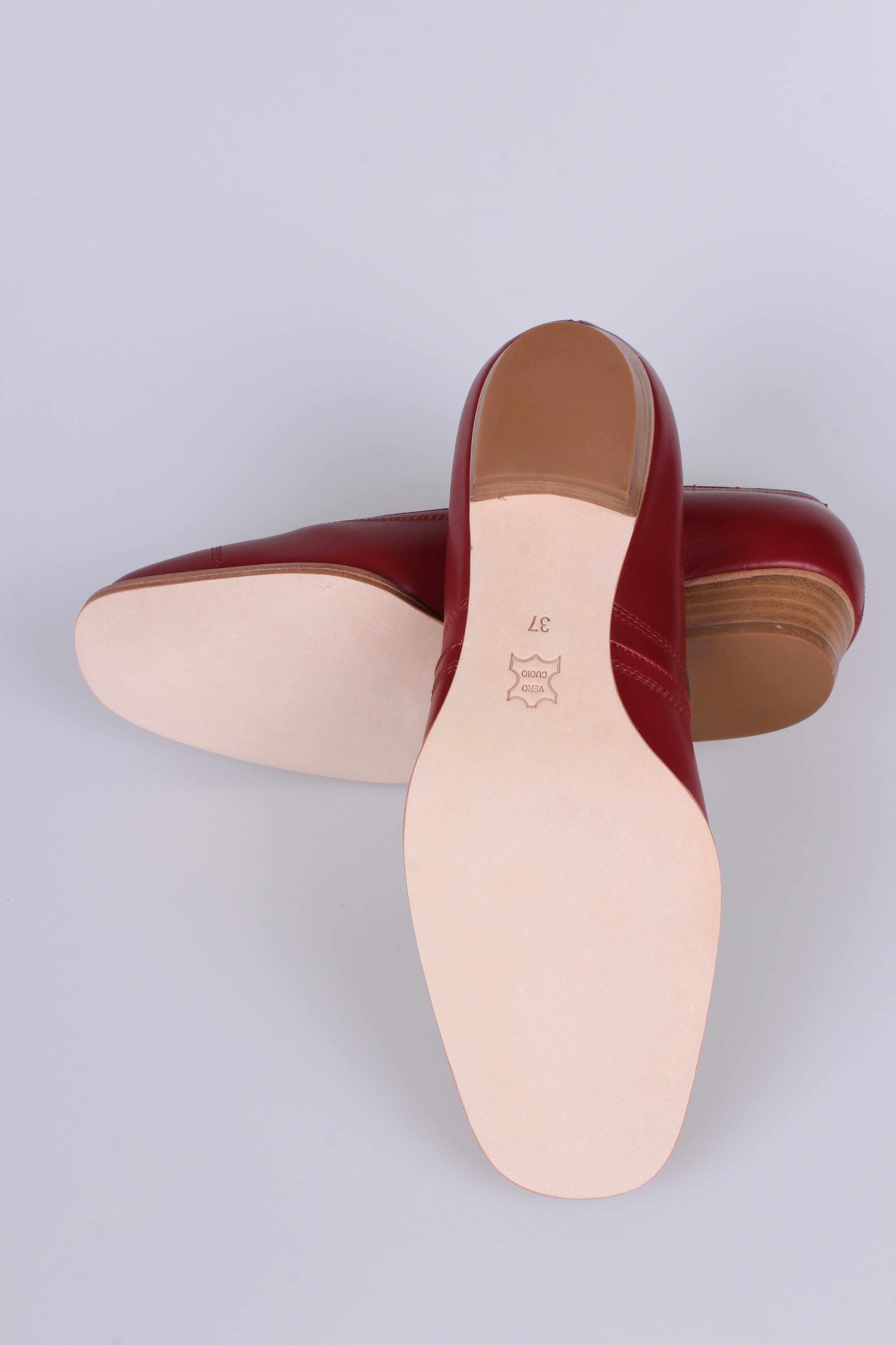 Materialer: Full-grain læder (kvalitetslæder), lædersåler, læder indersåler med silikone indlæg, læderfoer og akryl knap.