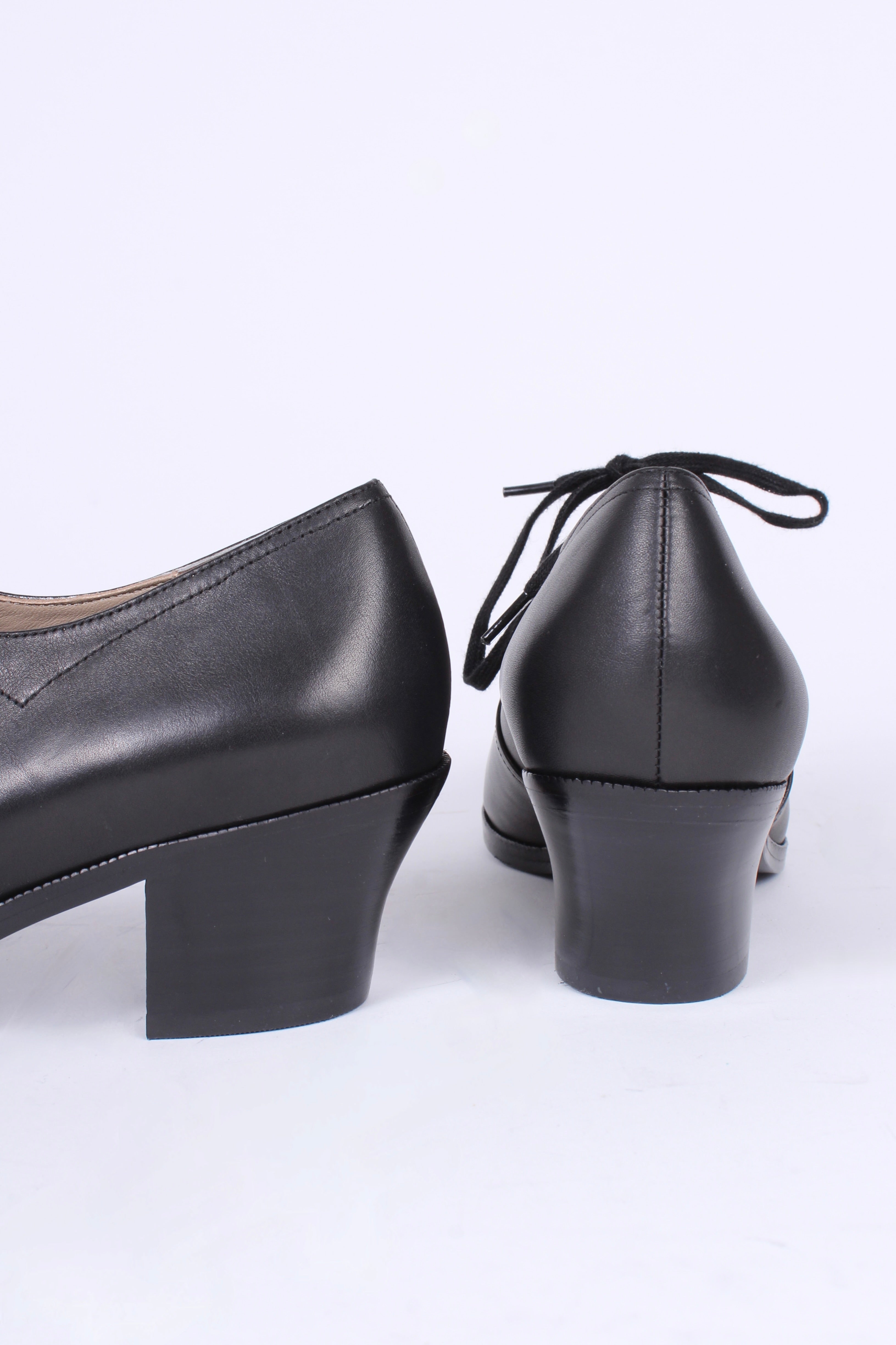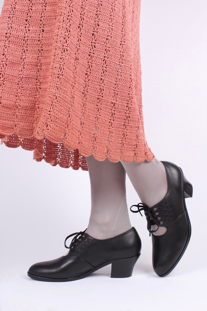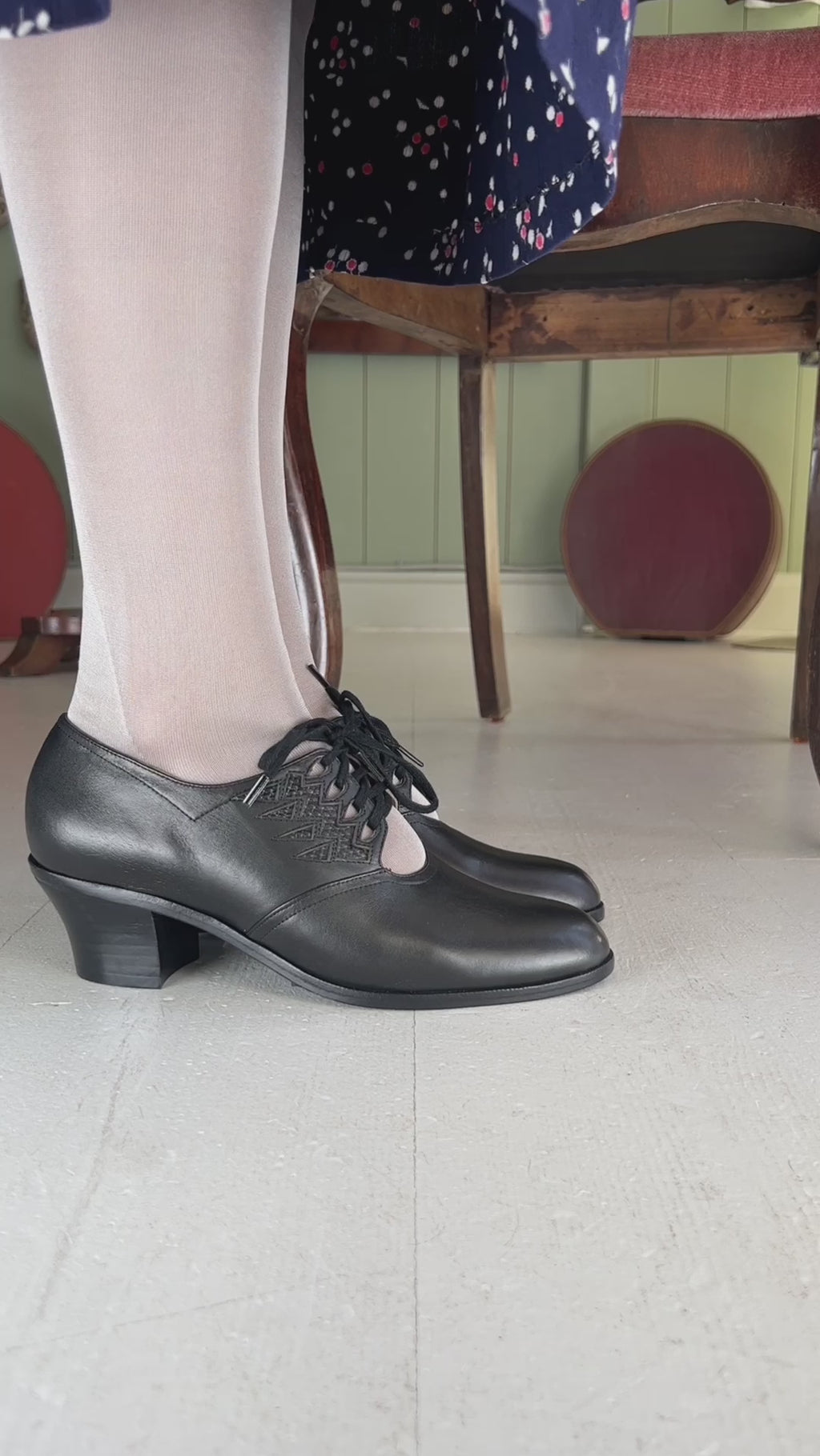 Disse charmerende hverdagssko er inspireret af 1930’ernes stil og har en elegant, kurvet militærhæl. Designet er slankt med en spids tå og smukke, håndlavede udskæringer hen over vristen, som giver skoen et feminint og tidløst udtryk.