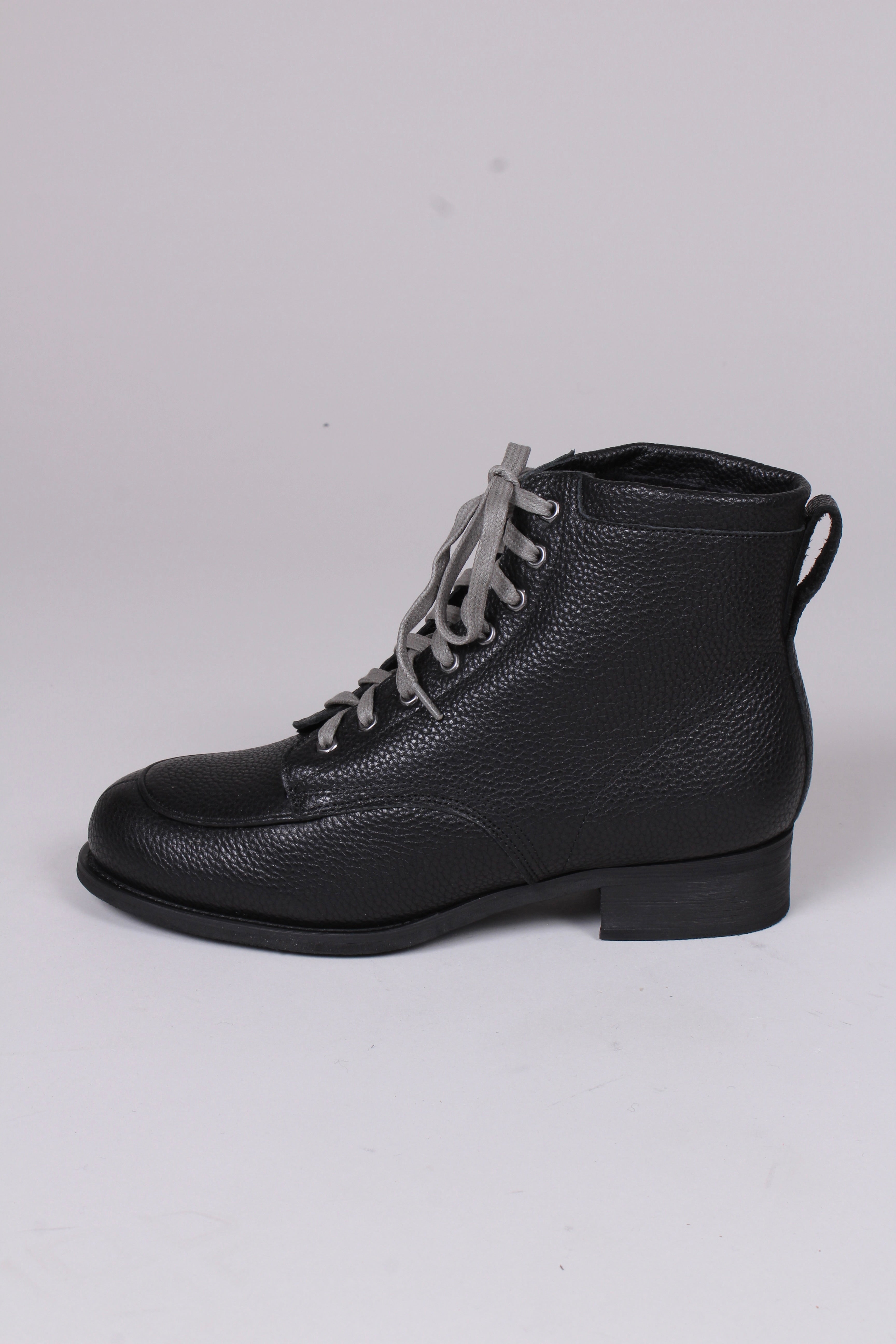 Disse klassiske mokkasinsnørestøvler er fremstillet i let struktureret læder og har et blødt, åndbart foer af lammeskind. Støvlerne er ankelhøje og lukkes med bomuldssnørebånd, der går gennem sekskantede metaløjer. Den afrundede snude giver god plads og komfort. Gummisålerne gør støvlerne velegnede til fugtigt vejr.