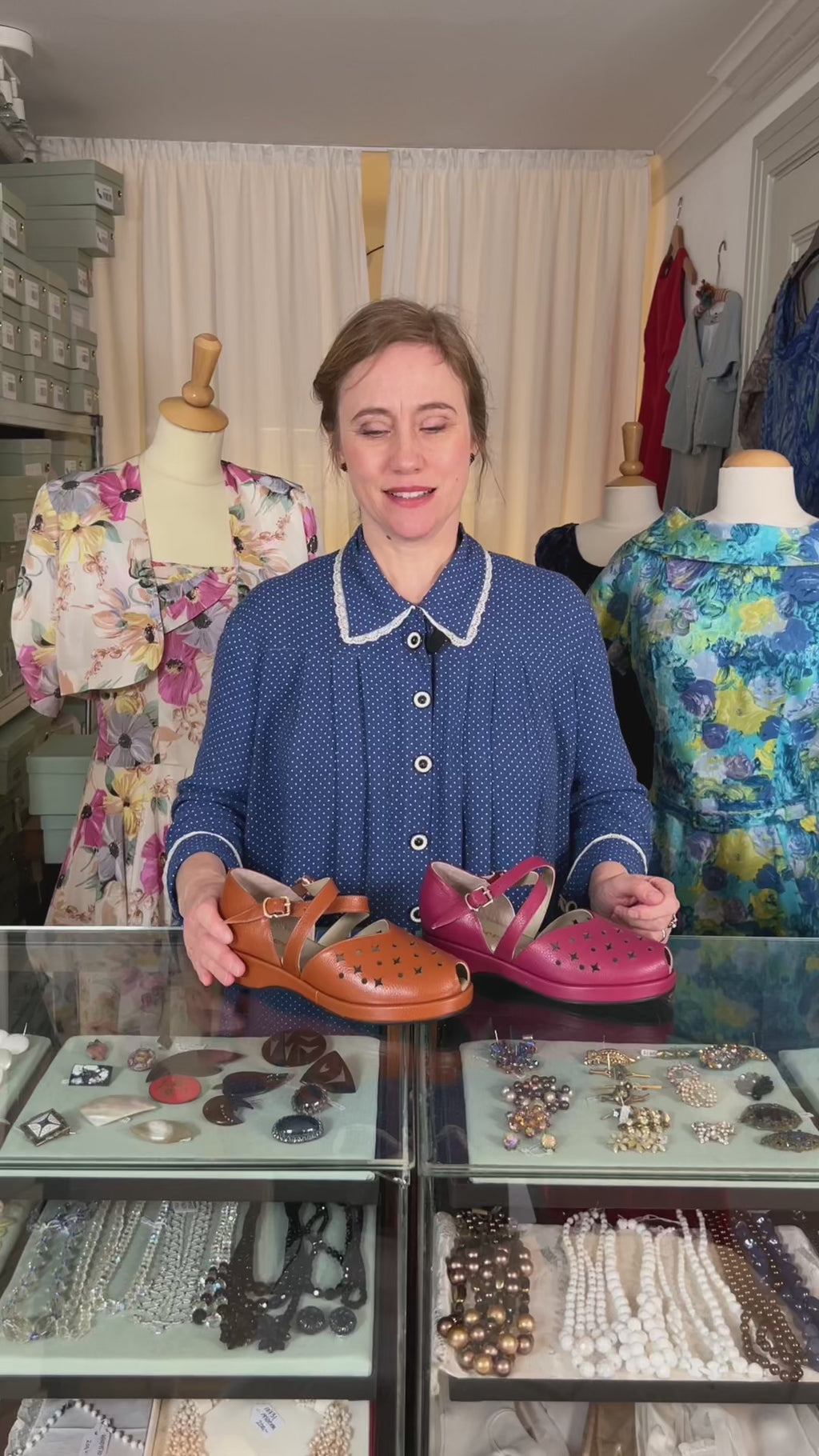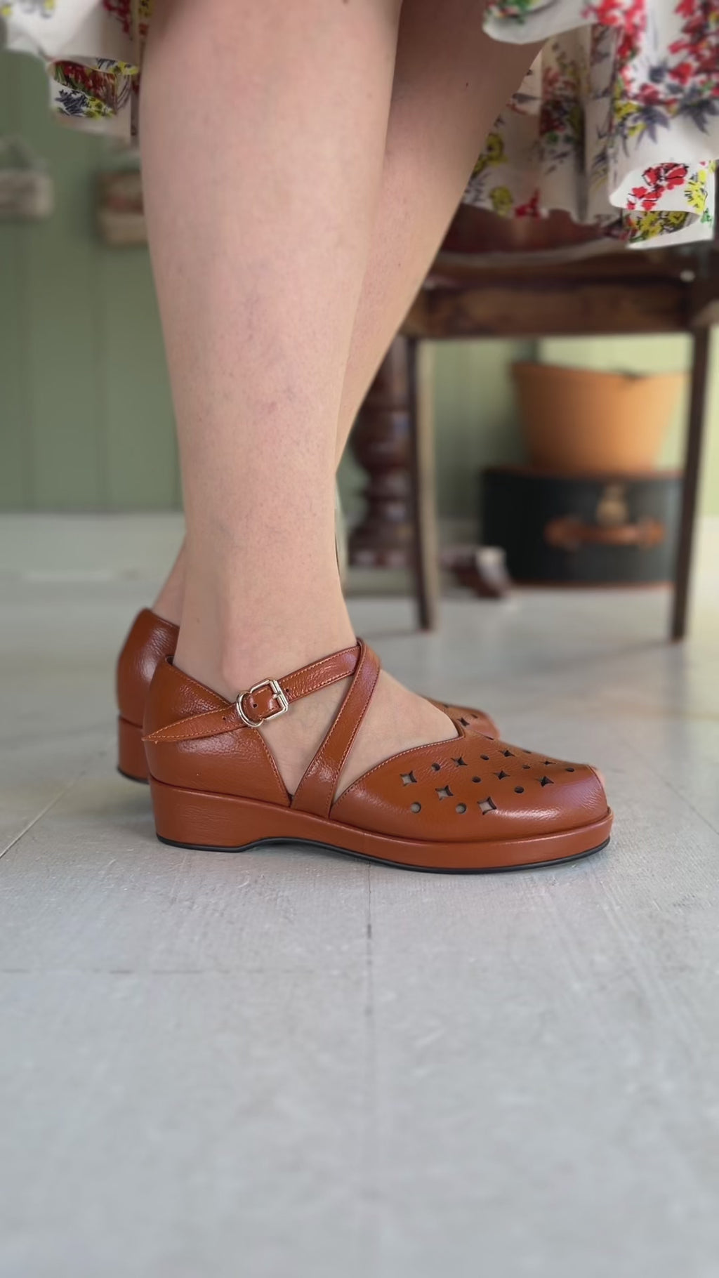 Fine 1940'er vintage inspirerede sommer sandaler / wedges med plateusål, hælekap, dobbelte ankelremme i kryds og peep toe. De to remme reguleres og lukkes med metalspænder i hver side. Skoene er fremstillet i blødt læder med fint udskåret hulmønster samt bløde læder indersåler.