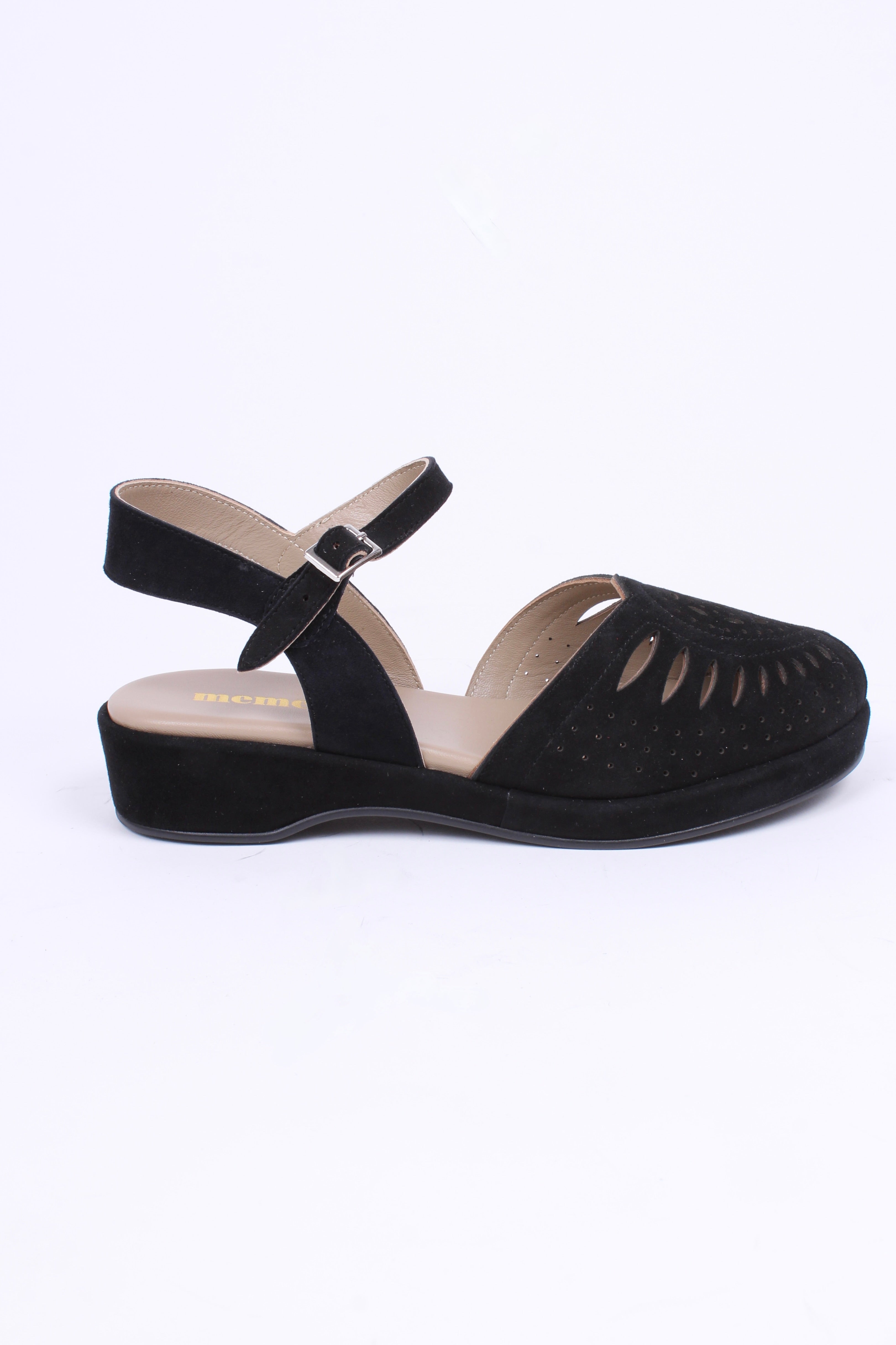Disse feminine wedge-sommersandaler, inspireret af 1940'erne og 1950'erne, har en smuk plateausål og en justerbar ankelrem. Fremstillet i blødt ruskind med et delikat, håndlavet hulmønster, kombinerer de vintage charme med moderne komfort.