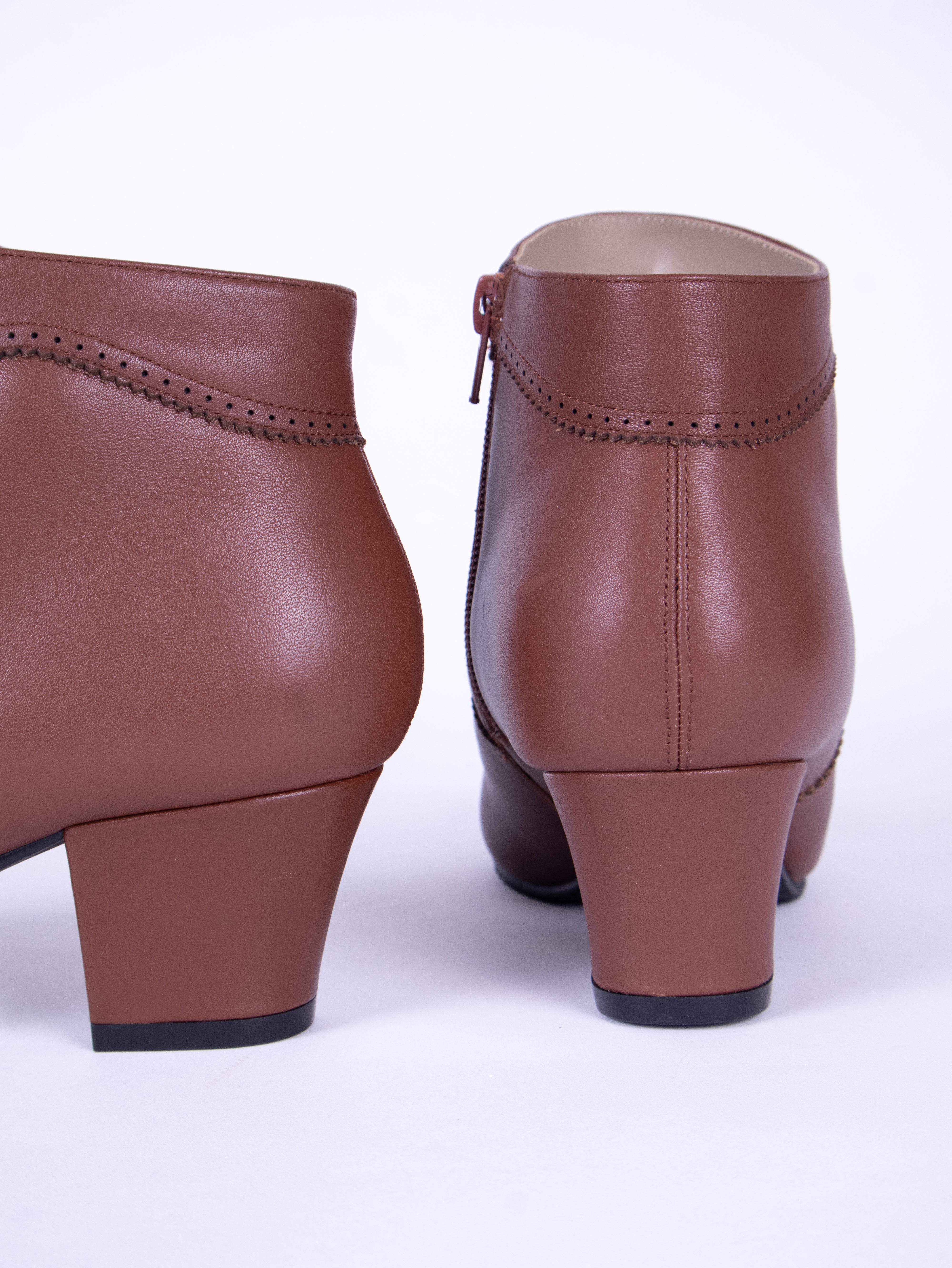 Støvlen har en afrundet og rummelig tåkappe, smukke brogue mønster og et slankt, kort støvleskaft. En metallynlås på indersiden gør den nem at tage af og på. Den solide, let buede hæl i mellem højde og det tætsiddende skaft giver støvlen god balance og et elegant og sofistikeret udtryk.