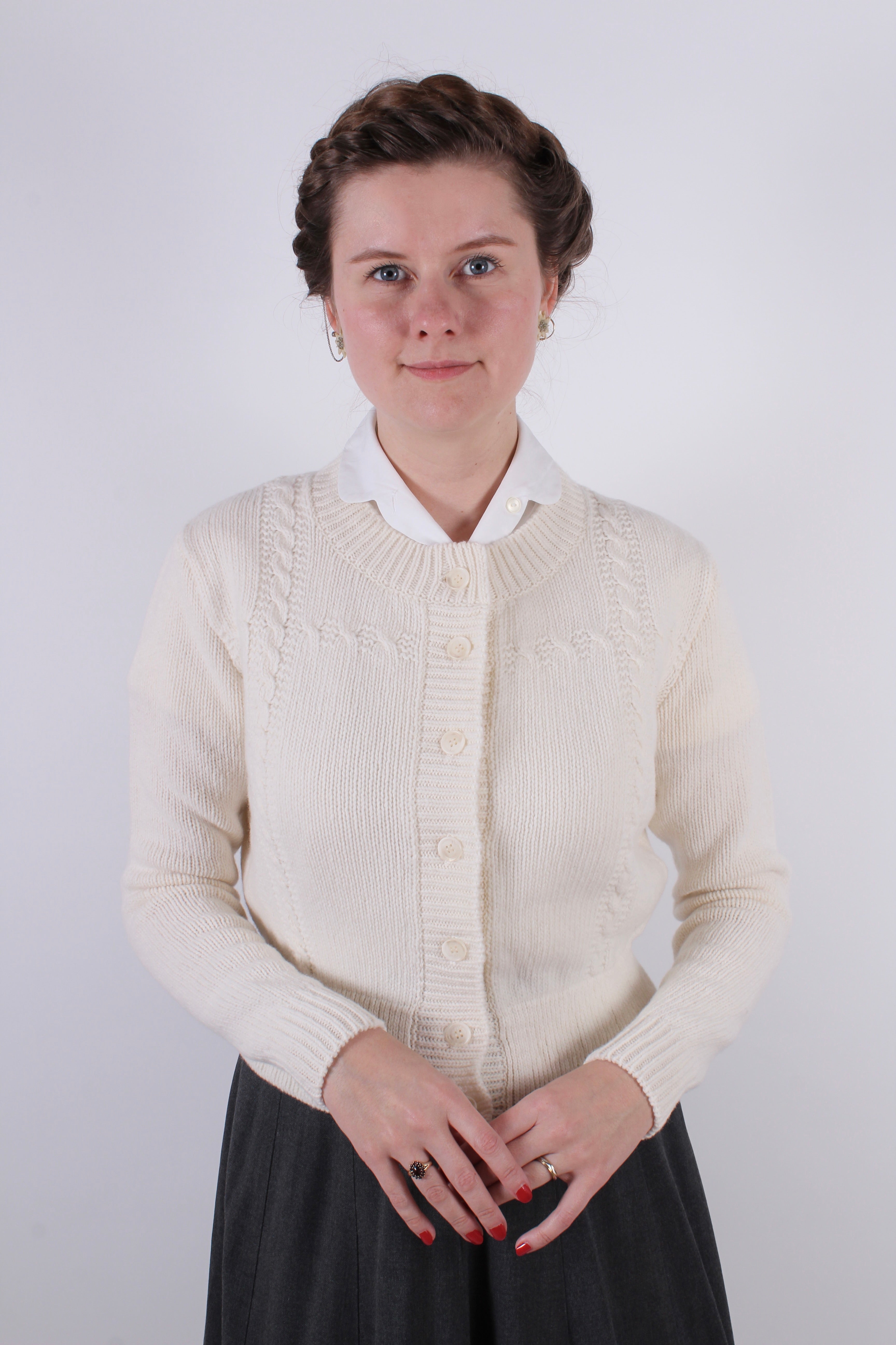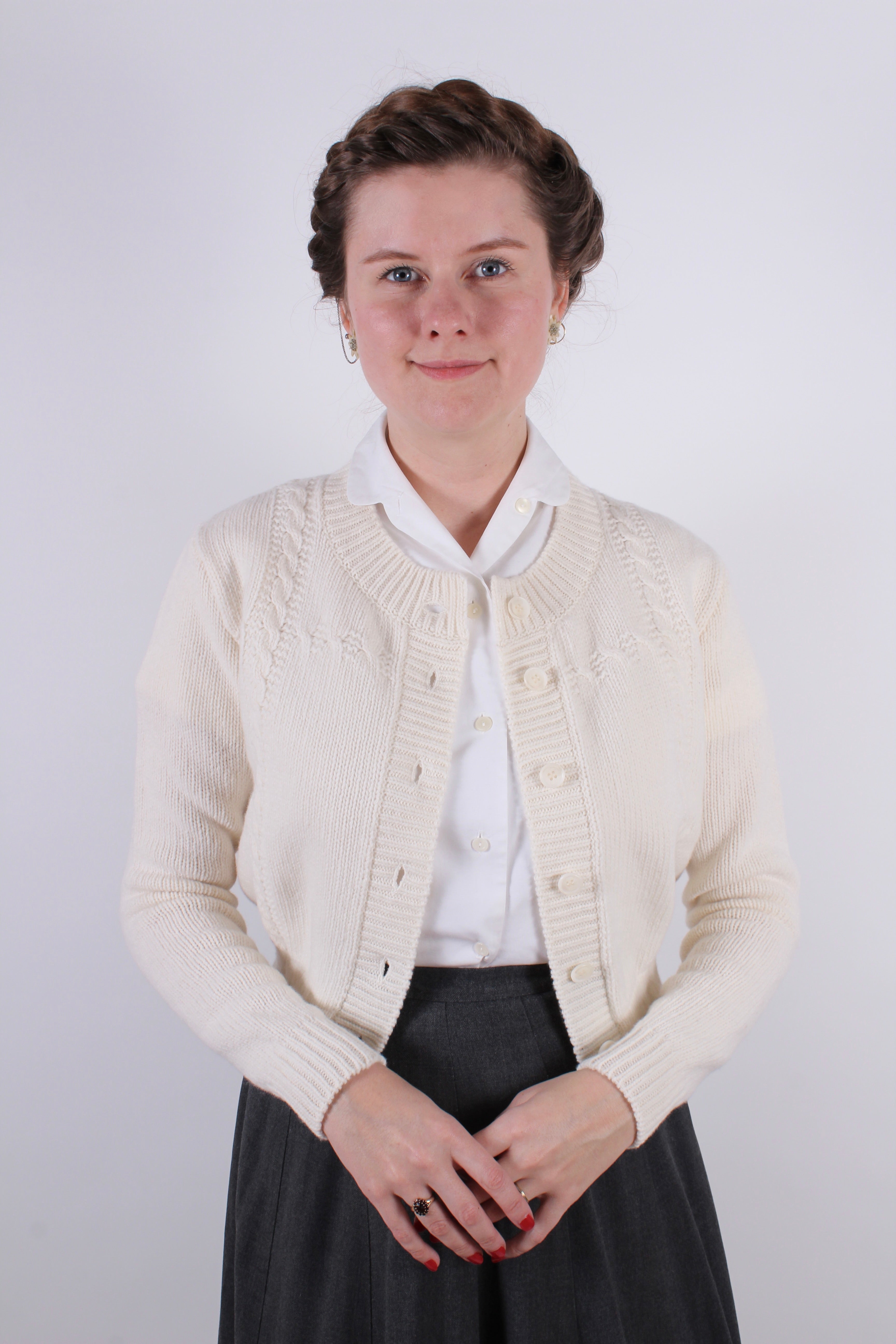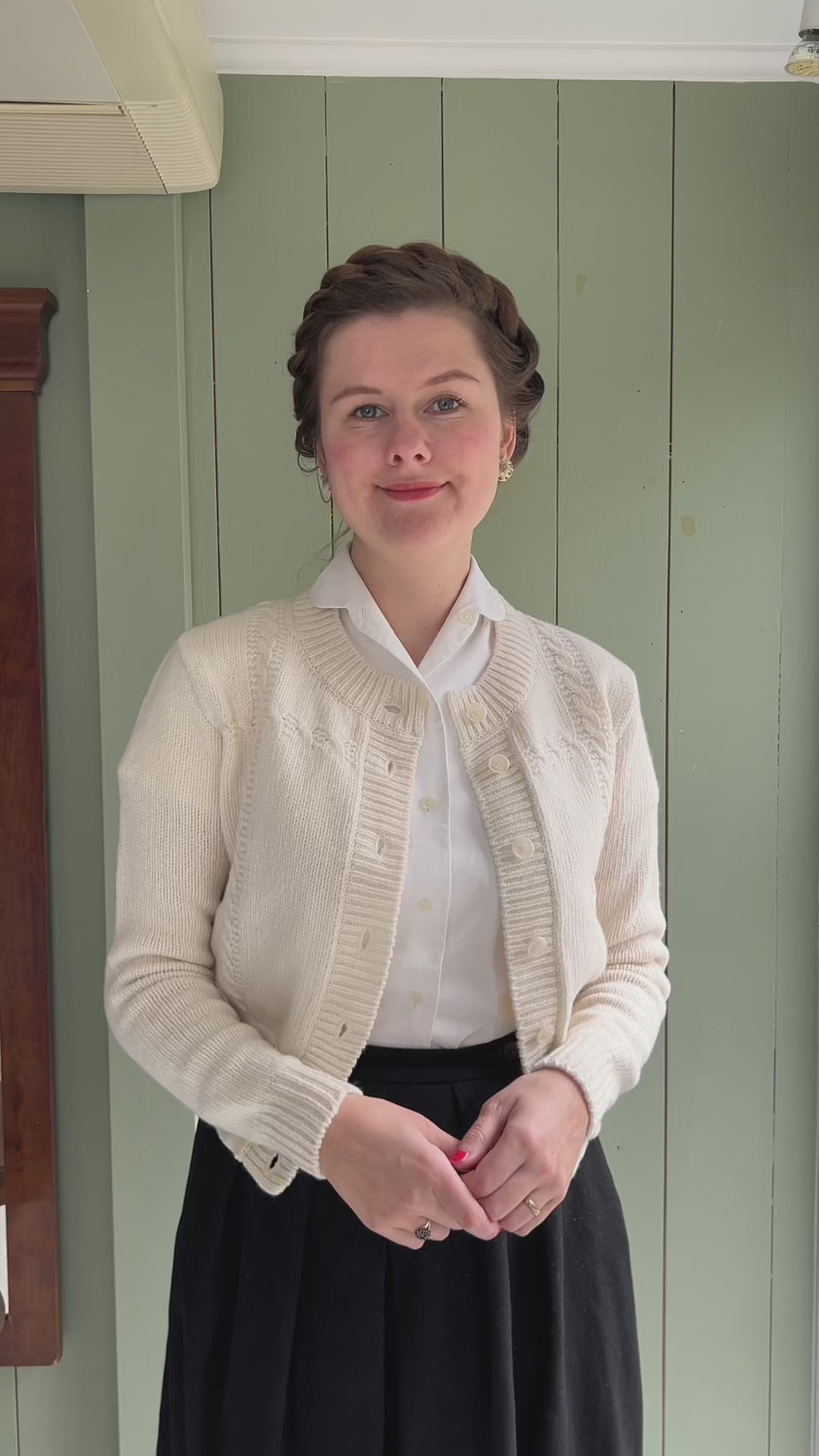 Sød og feminin 1940'er / 1950'er inspireret cardigan fremstillet af 100 % ren Merinould med dekorativt kabelmønster. Cardiganen er figursyet og fremhæver barm og talje. Længden er en smule kort, og den går til lige under taljen. Blusen er med bred ribkant under taljen, hvilket gør blusen klædelig til kjoler, højtaljerede nederdele og bukser. Ærmerne er lange, tætsiddende og afsluttes med ribkant. Blusen lukkes med 7 knapper i matchende farve.
