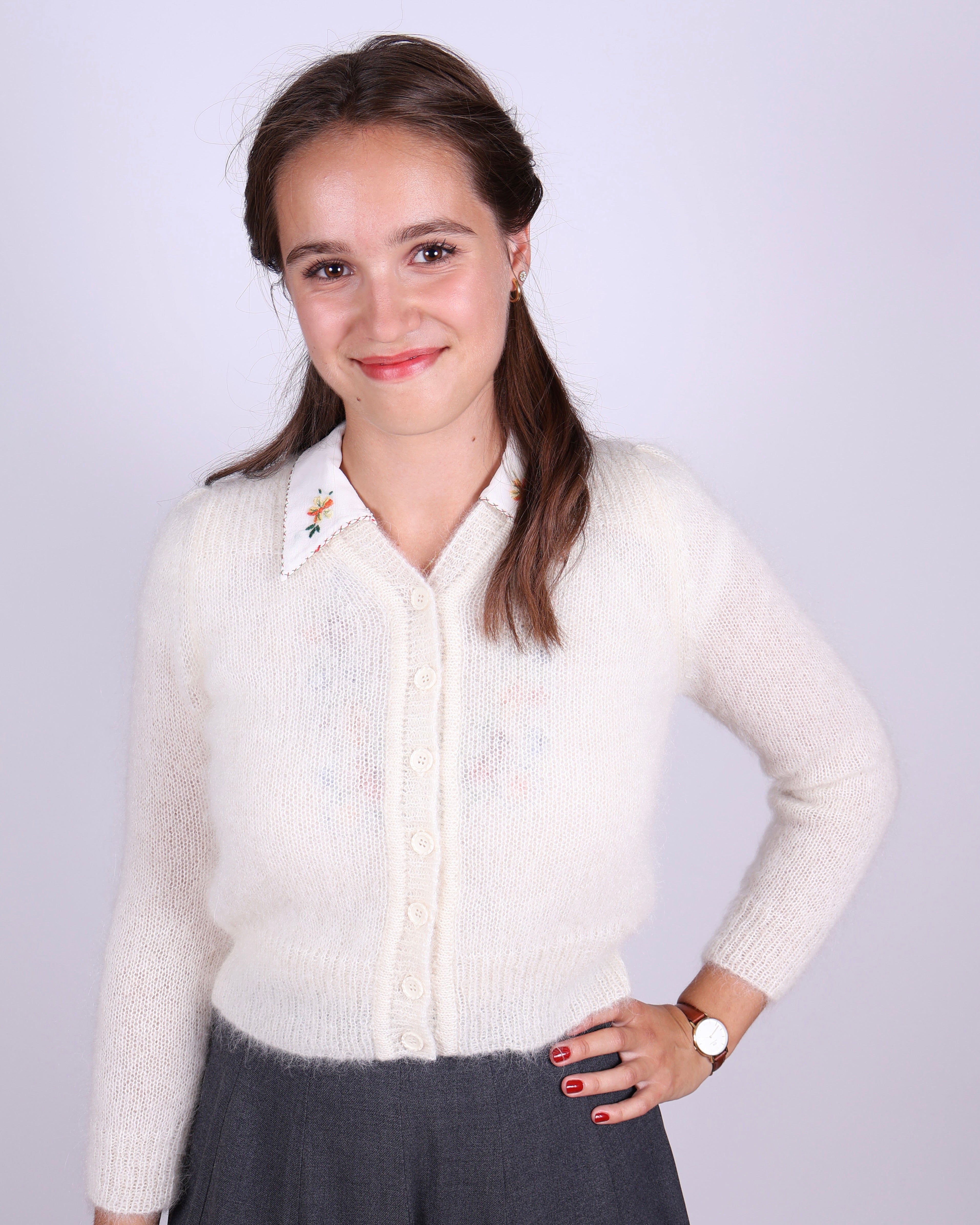 Let og lun cardigan med vintageinspiration fra 1940’erne, fremstillet i en eksklusiv mohairblanding. Cardiganen er ultra feminin med tætsiddende, lange pufærmer, en klædelig V-formet halsudskæring med plads til en krave under, samt et sødt ribmønstret bærestykke både foran og bagpå. Den lukkes med syv små, detaljerede knapper.