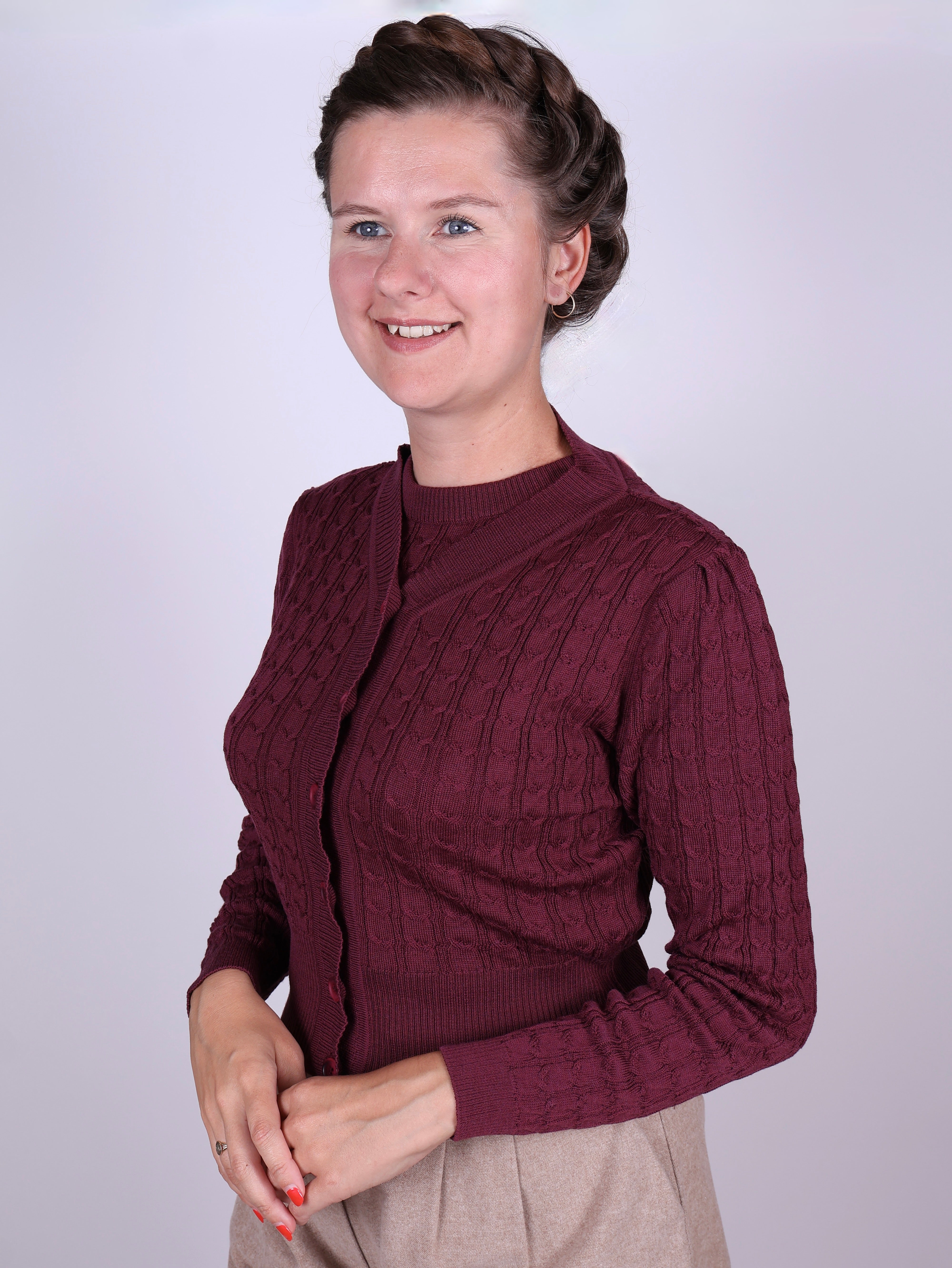 Denne cardigan er designet til at passe perfekt sammen med vores Sally-pullover, som deler samme mønster og materiale. Style den med højtaljede nederdele, elegante bukser eller over din yndlingskjole for et komplet vintageinspireret outfit. En uundværlig tilføjelse til garderoben for enhver, der elsker feminin elegance.