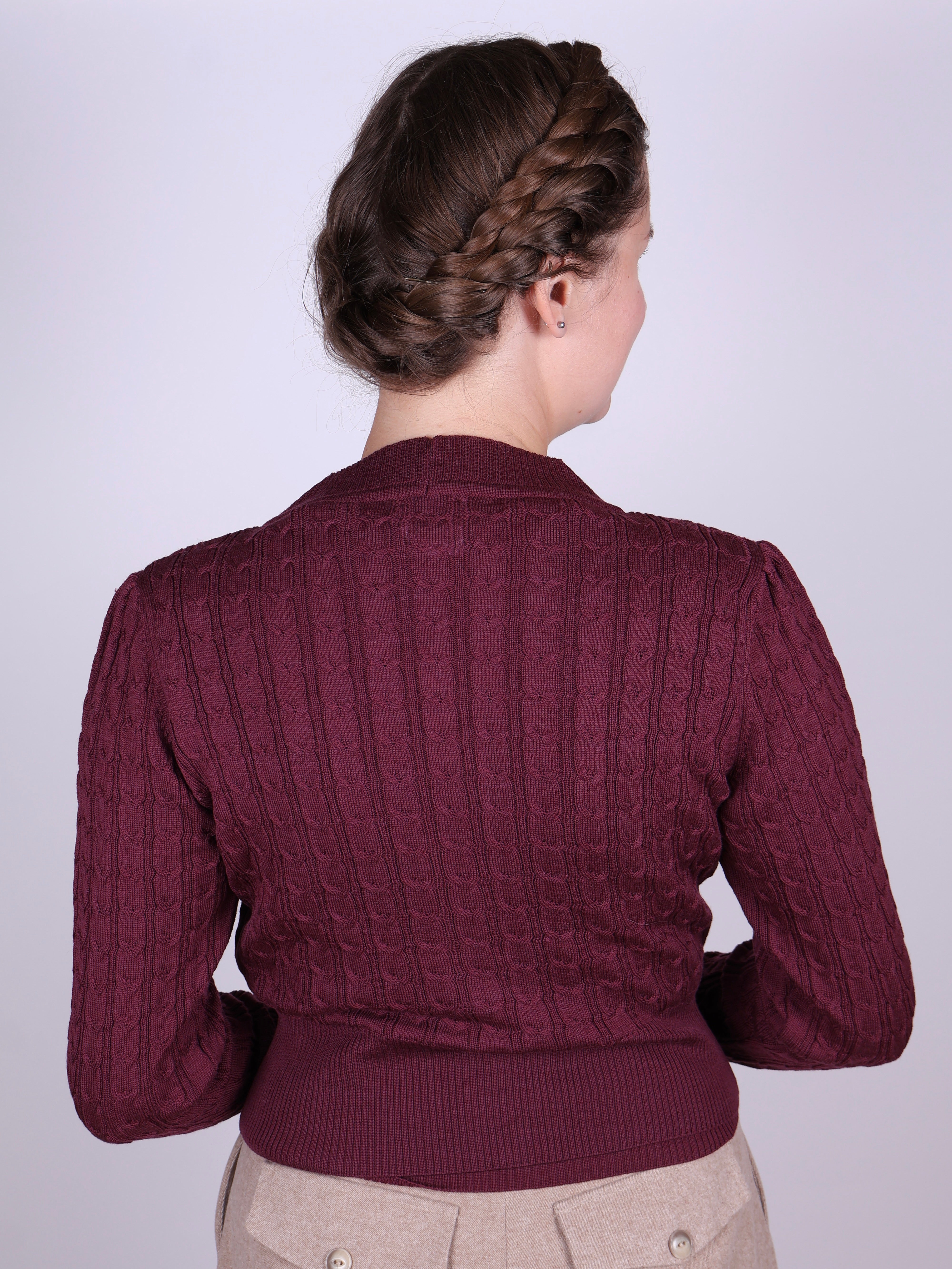Joanne er en 1940’er/1950’er-inspireret cardigan, fremstillet i 100 % blødt, tyndt og luksuriøst merinouldsgarn. De elegante pufærmer og det dekorative kabelstrikmønster emmer af tidløs charme. Med sin V-udskæring og syv fine knapper er cardiganen både praktisk og stilfuld – perfekt over en skjorte eller kjole med krave, eller som en del af et lag-på-lag-look.