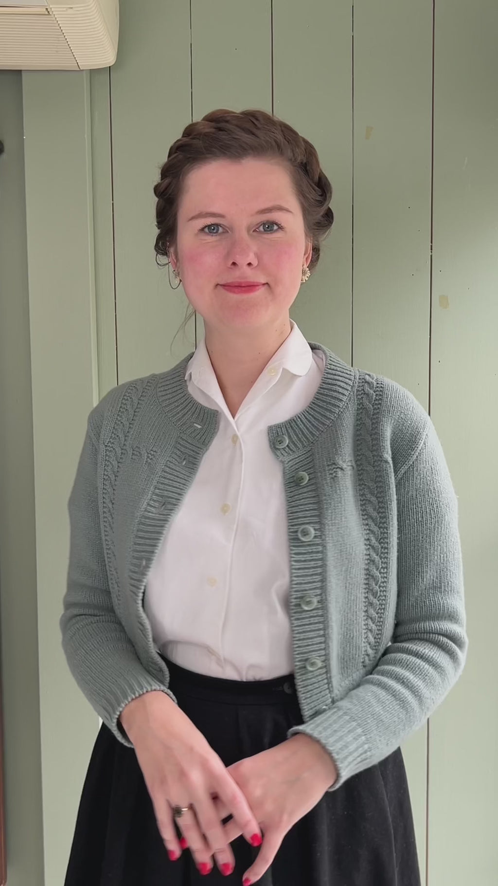 Sød og feminin 1940'er / 1950'er inspireret cardigan fremstillet af 100 % ren Merinould med dekorativt kabelmønster. Cardiganen er figursyet og fremhæver barm og talje. Længden er en smule kort, og den går til lige under taljen. Blusen er med bred ribkant under taljen, hvilket gør blusen klædelig til kjoler, højtaljerede nederdele og bukser. Ærmerne er lange, tætsiddende og afsluttes med ribkant. Blusen lukkes med 7 knapper i matchende farve.