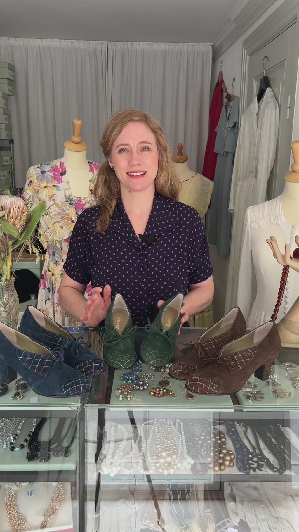 Skoene er typiske for 1940’erne med lidt rund snude og elegante høje hæle som giver et flot og glamourøst udtryk. Hælenes lidt kraftige facon giver god komfort og stabilitet. Snørebåndene er kun til pynt, og skal ikke åbnes når skoen tages på.